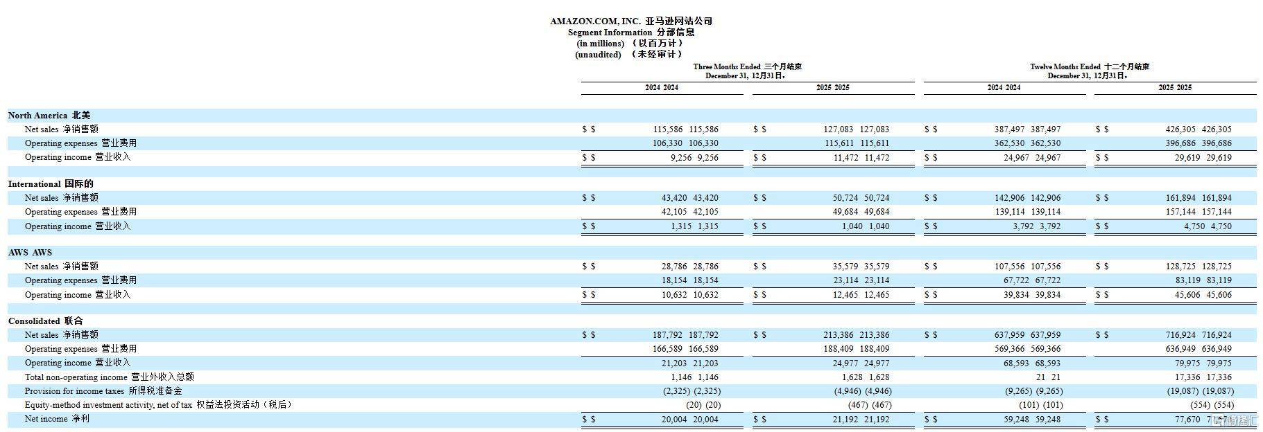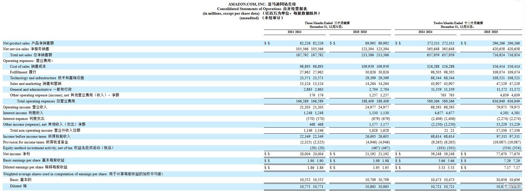2025年,亚马逊全年净销售额增长12%,达到7169亿美元,2024年为6380亿美元。