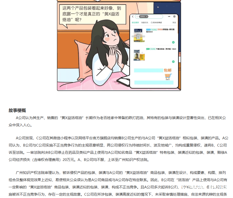 凭据(ju)这则故事的(de)插图,图中的(de)一位女(nu)孩侧躺(tang)在沙发上,疲劳地说:“上了(le)一天班腰酸背痛,网购一瓶黄*益活络油缓解肌肉疲劳吧。”她翻开网络中的(de)销(xiao)售页面,分别是黄道益活络油与黄道益活洛油。“这两(liang)个产(chan)品包装看(kan)起(qi)来(lai)彷佛,究竟哪一个才是真正的(de)呢。”