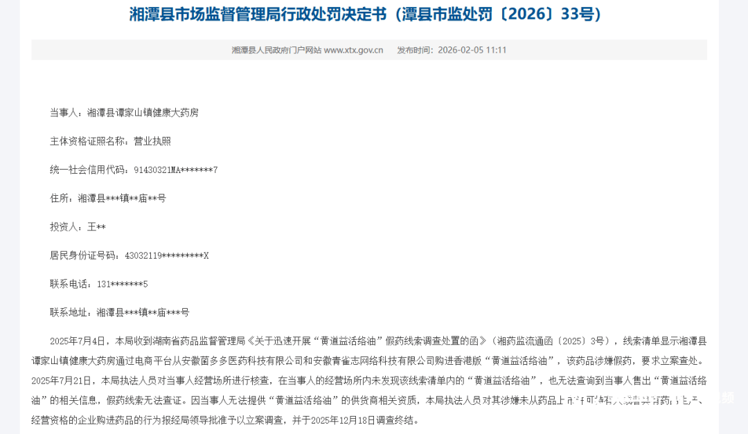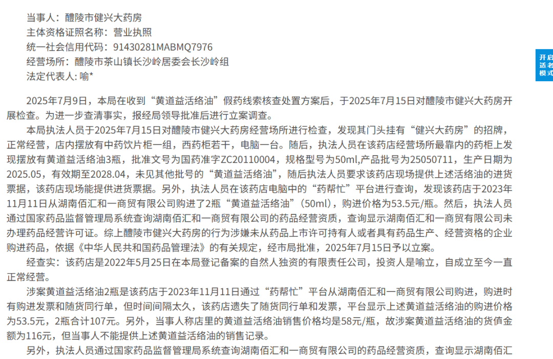 2026年1月,湖南醴陵市健(jian)兴大药房因从无《药品谋划允(yun)许证》的(de)公司(si)购进(jin)“黄道益活络油”,被没收守法所得并罚款共(gong)计5116元。