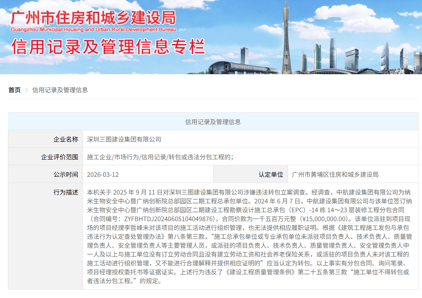 南都·湾财(cai)社记者注意到,深圳三图建设集团有限公司因涉嫌转包工程,被广州市住房和城(cheng)乡建设局于2026年3月12日上网公示。