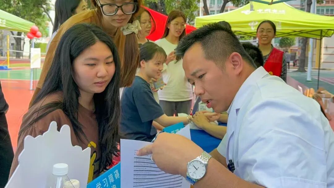在广州圣泉医院的摊位前,心理科曹永欣主任带着温暖的笑容,为同学们提供一对一心理咨询服务。面对学业压力、睡眠困扰和情绪焦虑,曹主任用专业的认知行为疗法(CBT)帮助大家找到问题的根源,并给出实用的建议。“不要和情绪对抗,试着接纳它,慢慢调整。”——这样接地气的指导让同学们豁然开朗。现场还设置了心理测评区,不少同学通过简单的测试更了解自己的心理状态,纷纷表示:“原来我的压力来自这里,现在知道怎么调整了!”