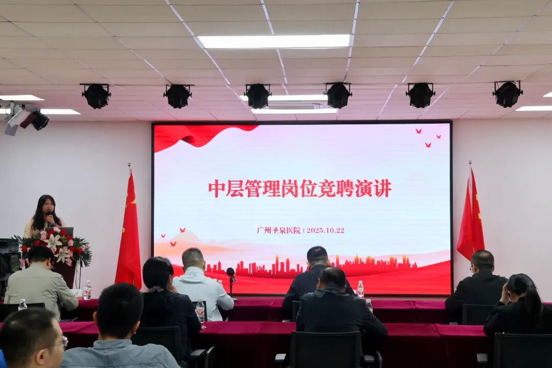 为加强医院管理队伍建设,优化人才发展机制,10月22日,广州圣泉医院举办中层管理岗位竞聘演讲活动。此次活动以公平、公开、公正为原则,旨在选拔一批德才兼备、勇于担当的优秀管理人才,为医院高质量发展注入新活力。