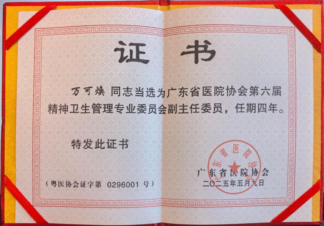 我院党支部书记万可焕当选为广东省医院协会第六届精神卫生管理专业委员会副主任委员。