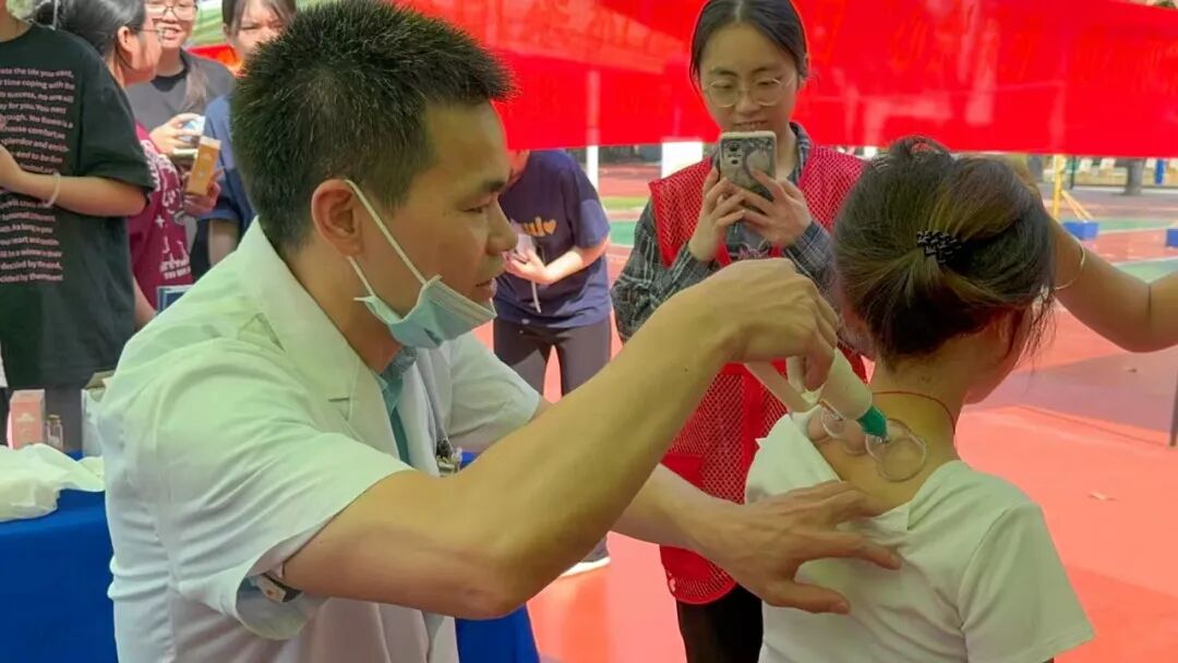 另一边的中医诊疗区,周日健主任的指尖正轻巧地将耳穴贴在一位女生的耳穴上,她的眉头随着按压的动作渐渐舒展。旁边的拔罐区,真空罐在同学们的后背形成整齐的排列,有人好奇地扭头想看,却被同伴用手机拍下这特别的"背部艺术"。体质辨识桌前,同学们轮流伸出舌头,医师仔细观察舌苔变化,时而询问作息饮食,然后给予她们个性化的调理建议。淡淡的艾草香在空气中浮动,不少体验完耳穴贴压的同学边走边不自觉地揉按着耳朵,三三两两讨论着"这里是不是就是失眠穴"——传统医学的智慧,就这样在年轻的群体中悄然传递。