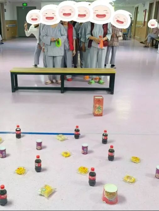 早期干预科开展了趣味滚滚乐游戏,参与者将瓶子滚向指定区域,达到目标即可获得相应奖励,大家兴致高昂、踊跃参与。现场还设置了套圈活动,地面摆放着水果、零食等大家喜爱的物品,患者们手持套圈,瞄准、投掷,每一次成功套中都引来阵阵欢呼,气氛轻松又热烈。