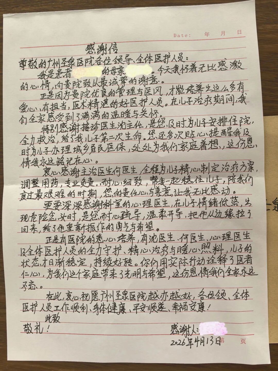 医者仁心,薪火相传;医患同心,温暖相伴。4月13日,广州圣泉医院早期干预科收到了一封来自患者家属朱女士的感谢信,字里行间满是真挚的感激,字字句句承载着对医护团队的认可与敬意,也映照出我院“以患者为中心”的服务初心与专业担当。